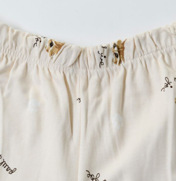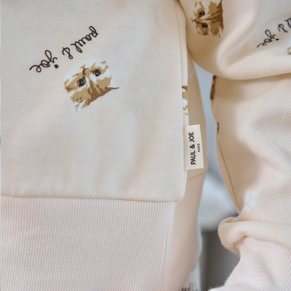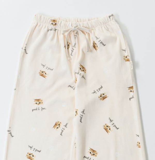裏起毛された保温性が高く感触が柔らかいふんわりとした着心地のスウェットです。袖口や裾にはリブが付いているので眠っていてもめくりあがることなく寒さを感じなくおやすみいただけます。ウエストのゴムは調節できるよう取り換え口があります。トップスの着丈は流行のショート丈になっています。猫とロゴが散りばられたとってもキュートなパジャマです。
