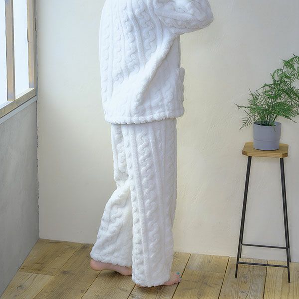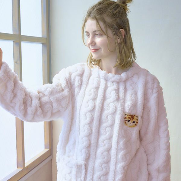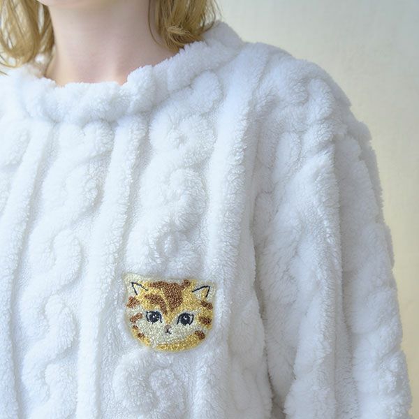 軽量で保温性のあるフリースの大きな縄目模様をかたどったもこもこ感がとっても可愛いパジャマです。大きめの作りなので羽織り感覚で着ていただけます。胸元にはブランドのアイコンの猫“ヌネット”がついており、一日の終わりに寄り添ってくれます。