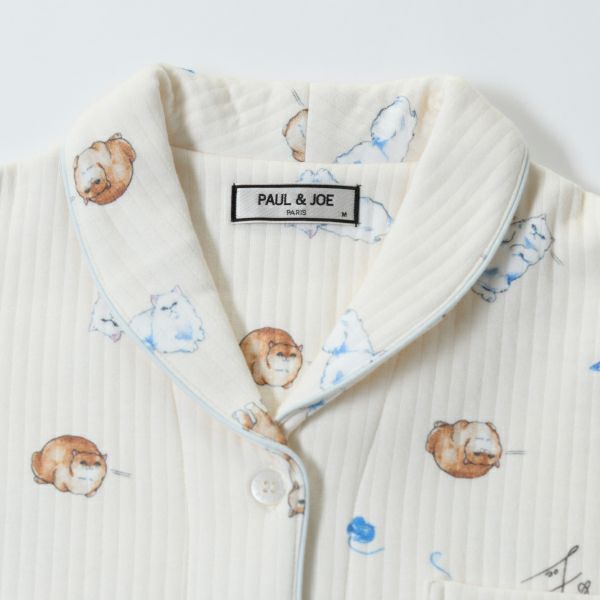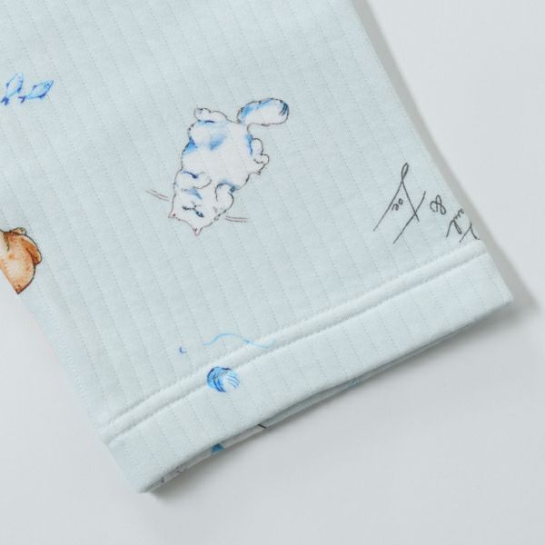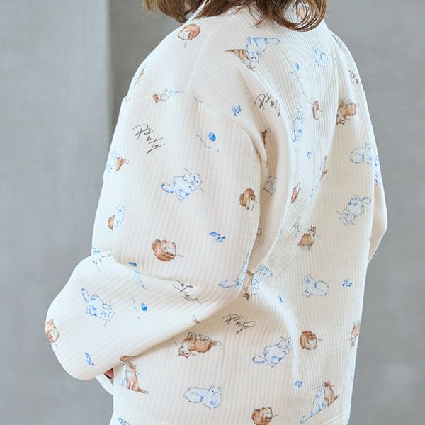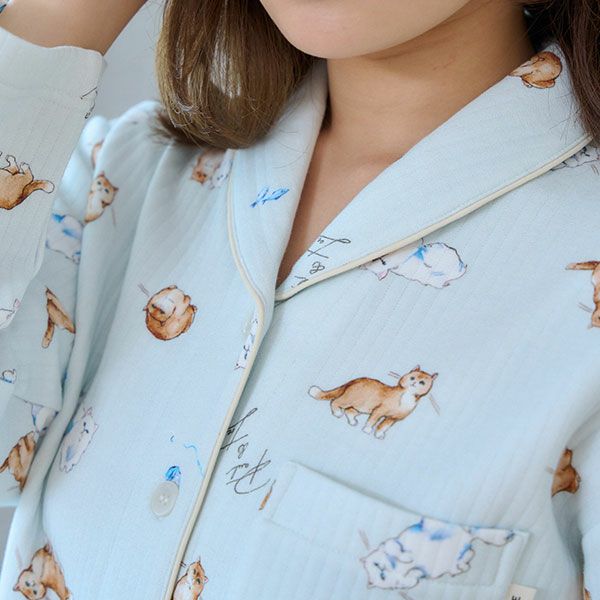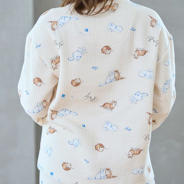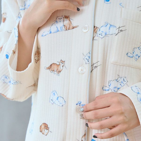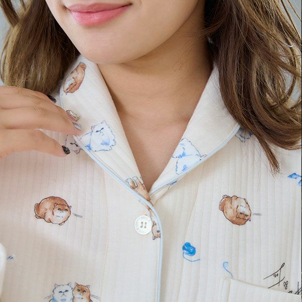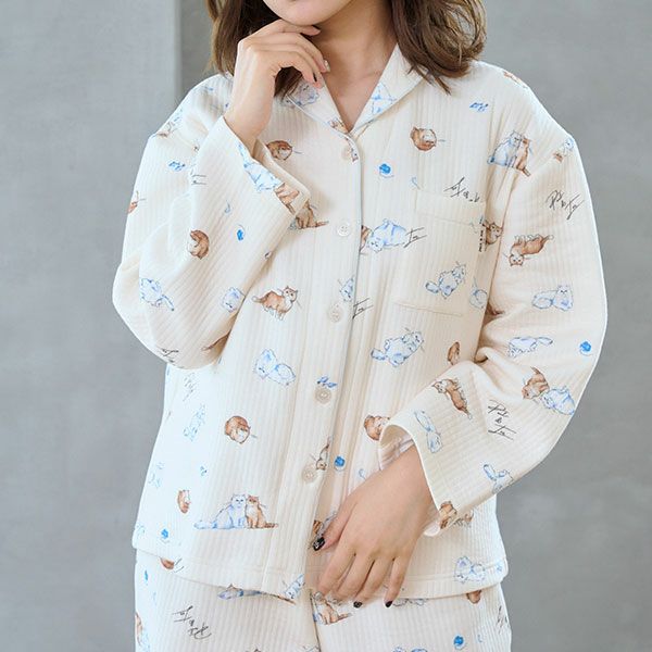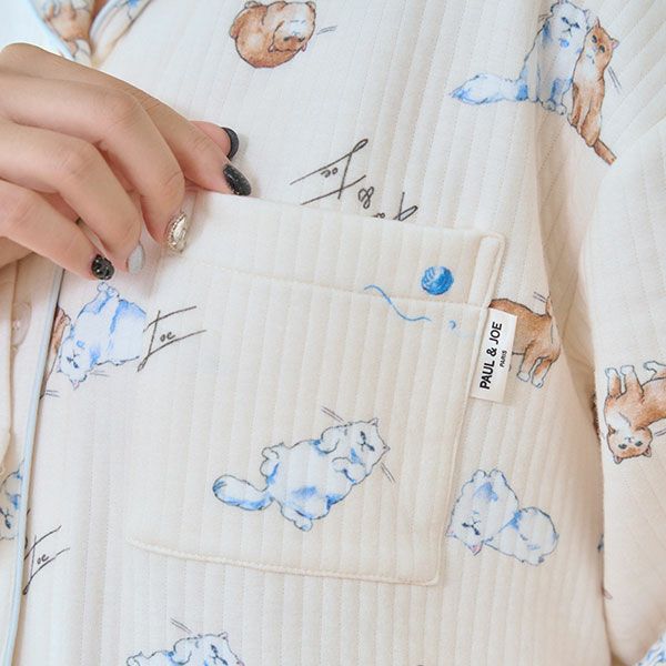 仲良く二匹の猫が毛糸で遊ぶ様子がプリントされたキルト素材です。表布と裏布の間にわたを詰めてステッチをいれることでふっくらとした温かみのある見た目と保温性があります。ベーシックなショールカラーのパジャマで前開きなので着脱がしやすいです。