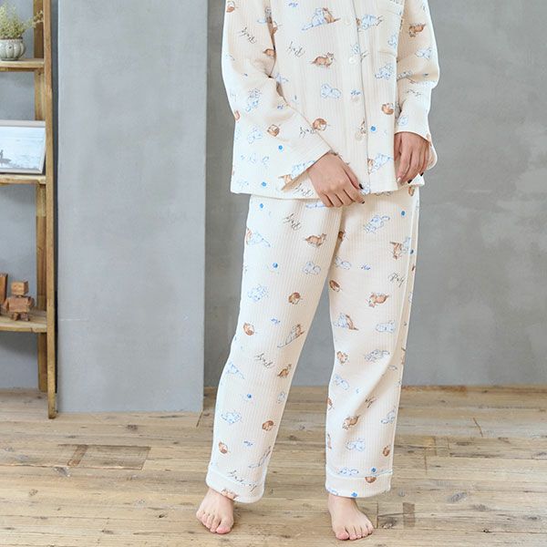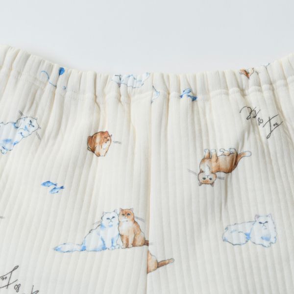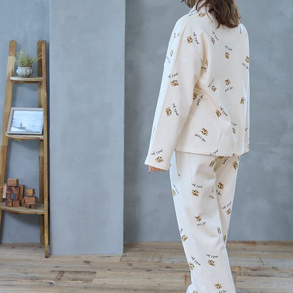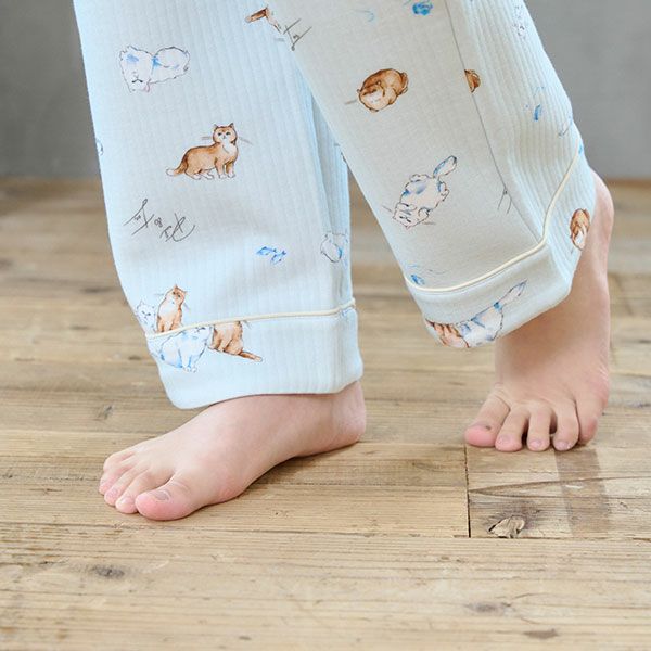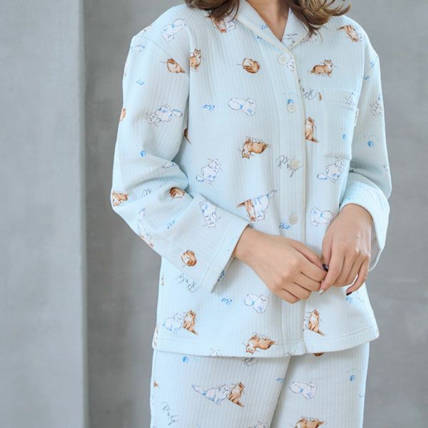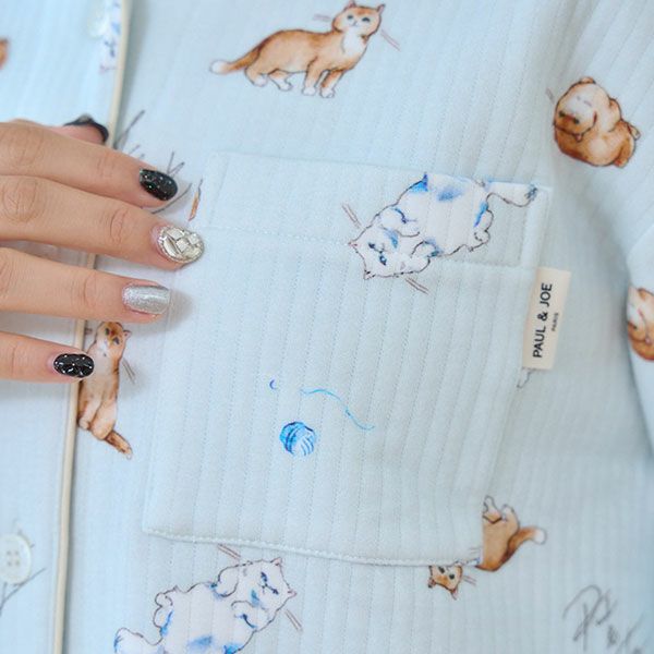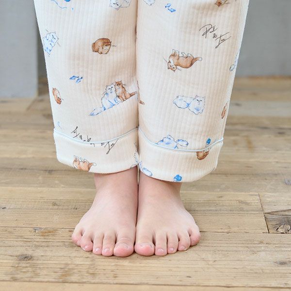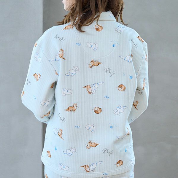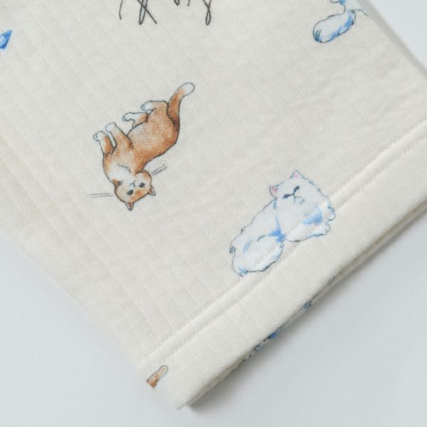 仲良く二匹の猫が毛糸で遊ぶ様子がプリントされたキルト素材です。表布と裏布の間にわたを詰めてステッチをいれることでふっくらとした温かみのある見た目と保温性があります。ベーシックなショールカラーのパジャマで前開きなので着脱がしやすいです。