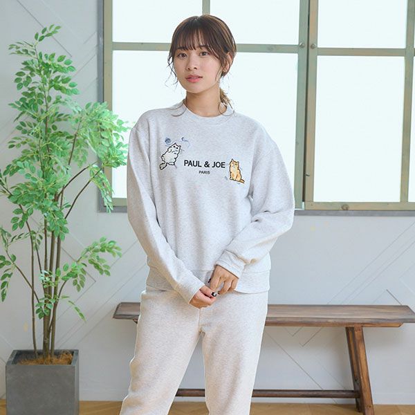 肌寒さを感じる季節に最適なふんわりと軽くあたたかいスウェットです。胸元のポール&ジョーのロゴと大きな二匹の猫の刺繍がインパクト抜群です。パンツはスッキリとした動きやすいシルエットです。