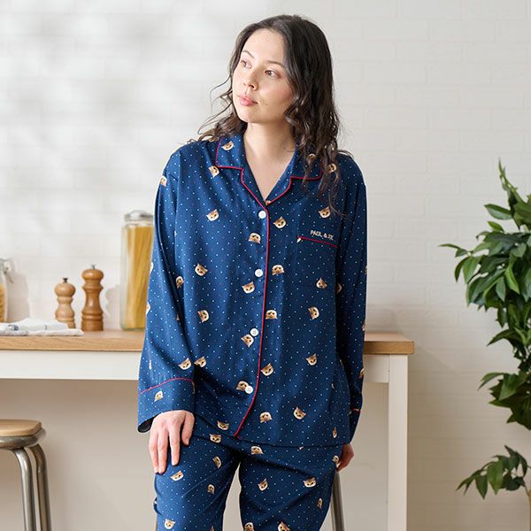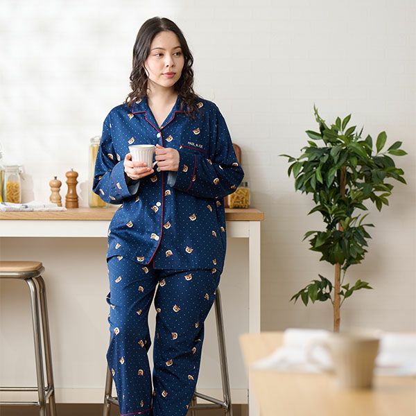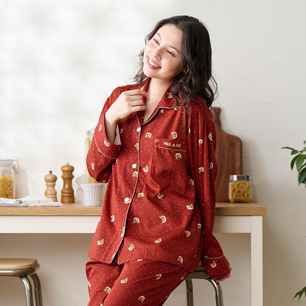 カラーは秋冬に映えるシックな赤と紺。リラックスタイムもぐっと華やかにしてくれる、贅沢な一着です。
