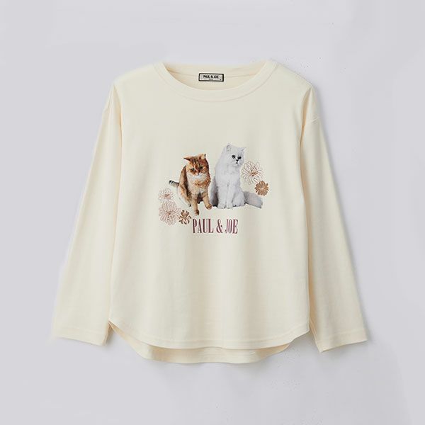 PAUL & JOEのアイコン猫、ヌネットとジプシーが仲良くお座りした愛らしいプリントのパジャマです。トップスの裾はラウンドカットで、さりげない可愛さをプラス。