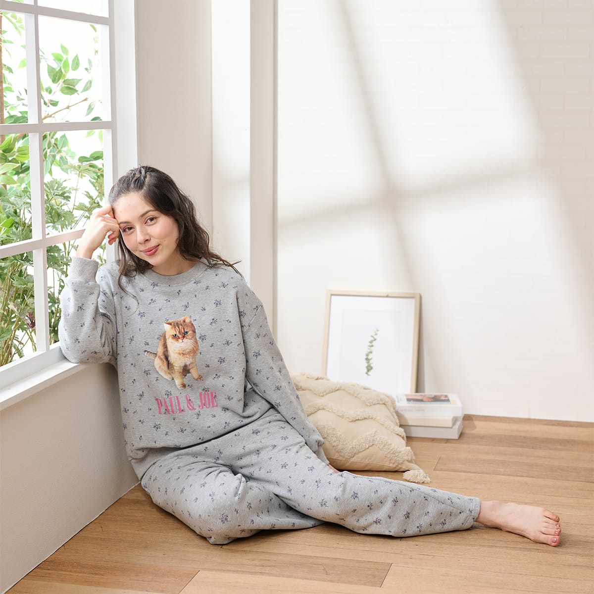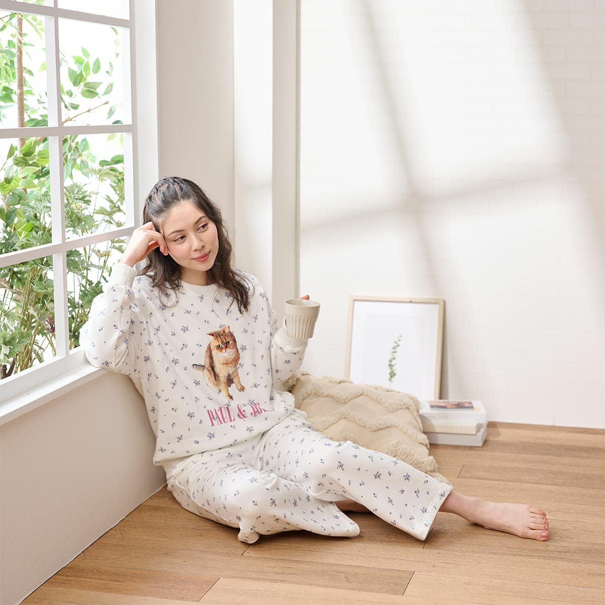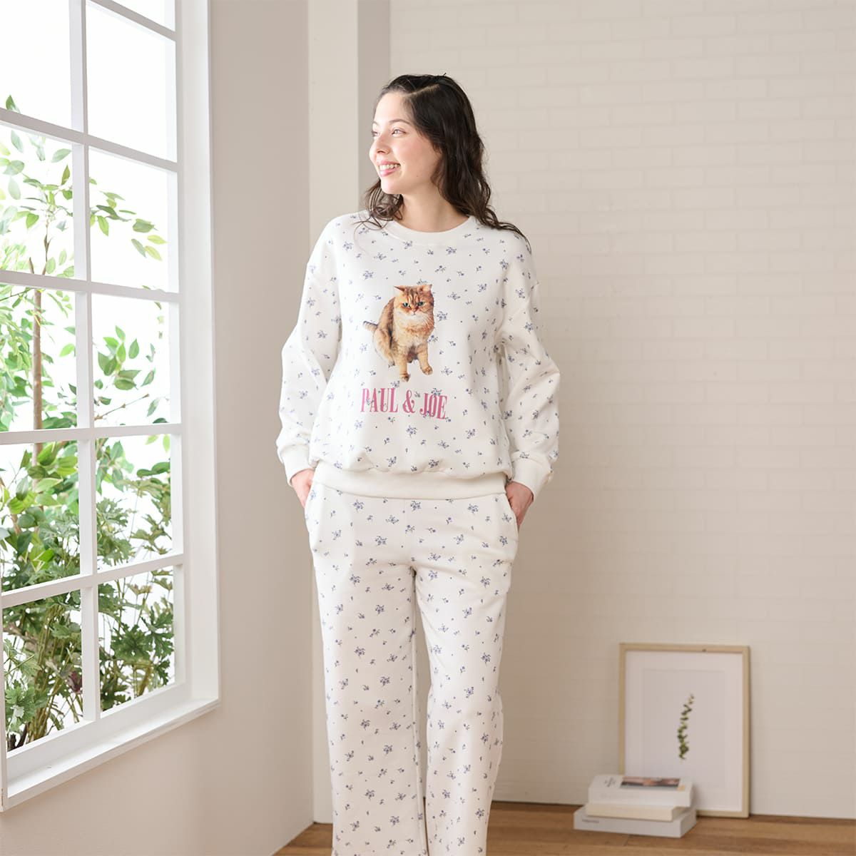 ベースに小花を散りばめたプリントの、裏起毛でふんわりもちもちのスウェットとストレートパンツのセットです。