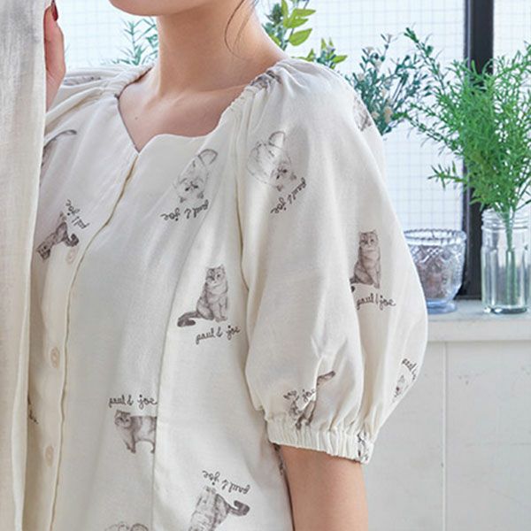 袖のパフスリーブがガーリーながら落ち着いたプリントで甘辛テイストに着ていただけます。