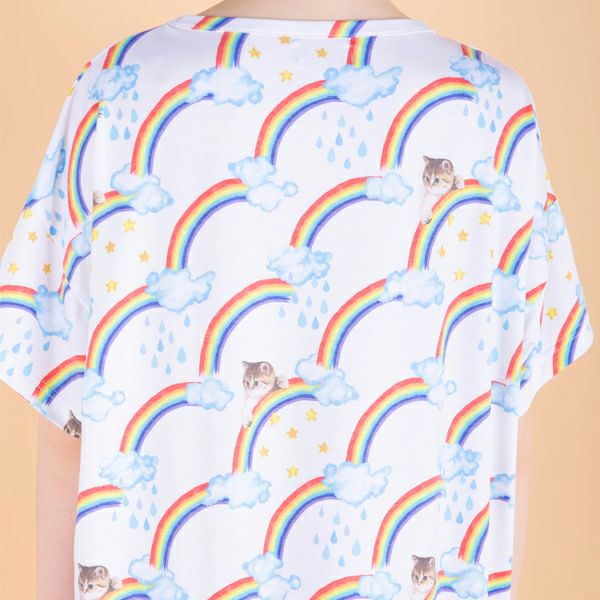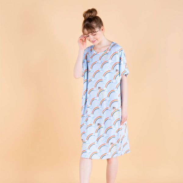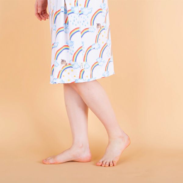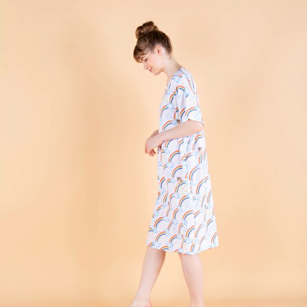 女性らしいとろみのある素材を使用した、ブランドアイコンのヌネットと虹の可愛い柄がプリントされたワンピースです。ゆったりめのシルエットに、膝丈まであるワンピースなので一枚でも着やすいアイテムです。両サイドにスラッシュポケットがついているのも便利です。