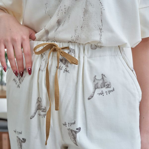ストレッチが効いたガーゼ素材を使用しており、ちょっとした動きにも生地がついていくので心地よくリラックスしてお過ごしいただけるロングパンツです。ポール&ジョーのアイコン猫、ヌネットとジプシーが堂々とお座りした様子がロゴと共に網点プリントされた、ノスタルジックな雰囲気を感じられる一枚です。