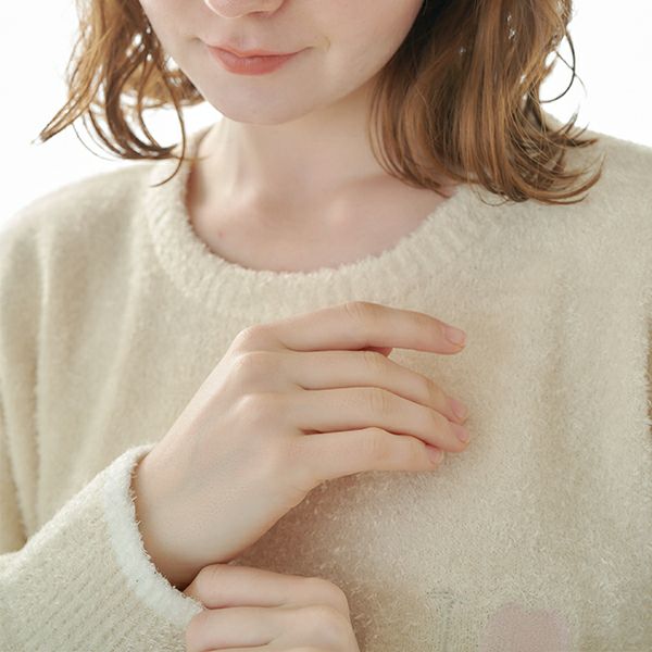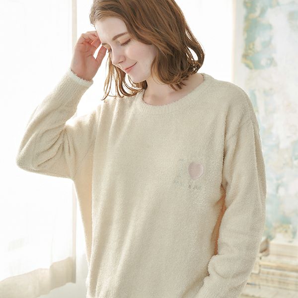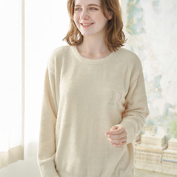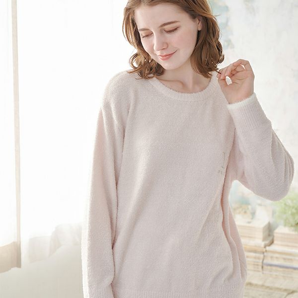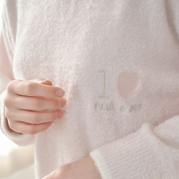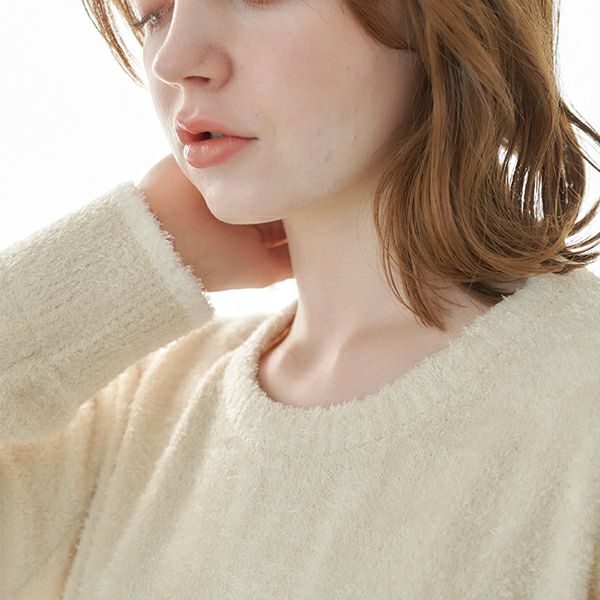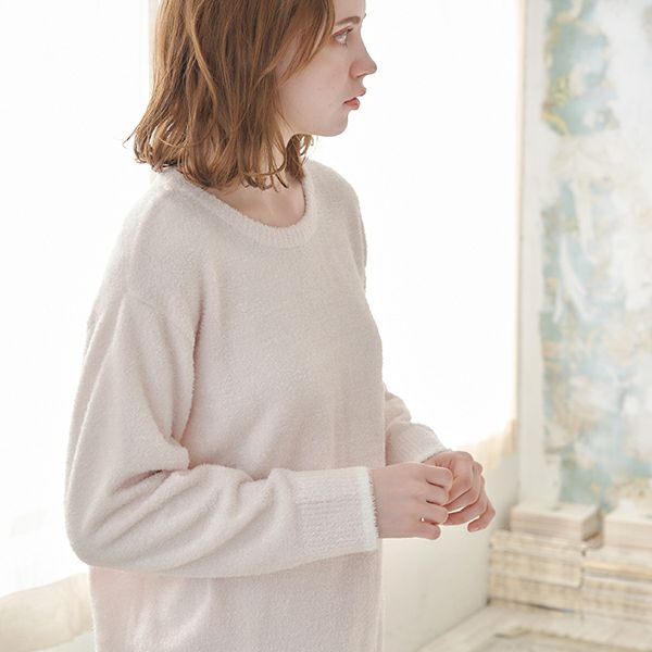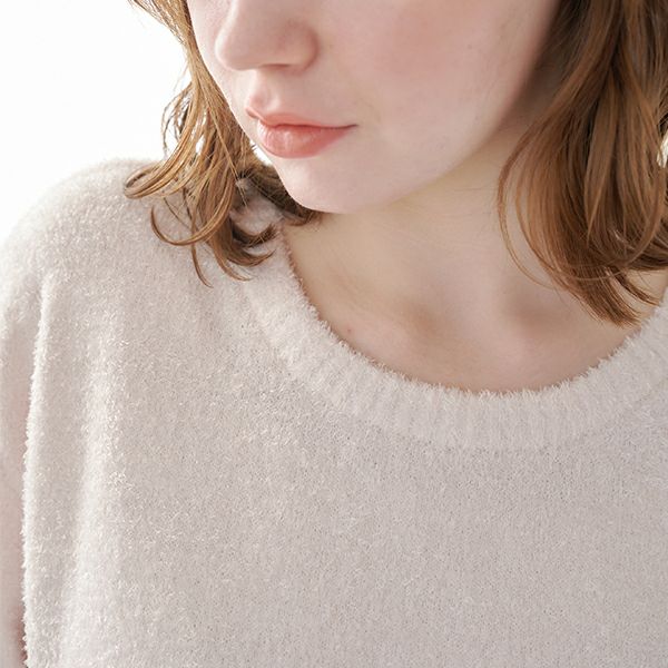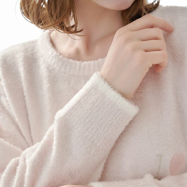 光沢のある毛足の長いニットを使ったベーシックな形のスポっと着られるプルオーバーです。軽くて柔らかく、見た目もかわいいモコモコ素材です。左胸にはI LOVE PJの刺繍を施し、袖と裾に白のラインを入れてワンポイントにしています。