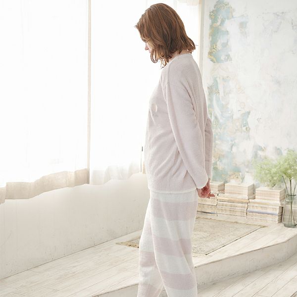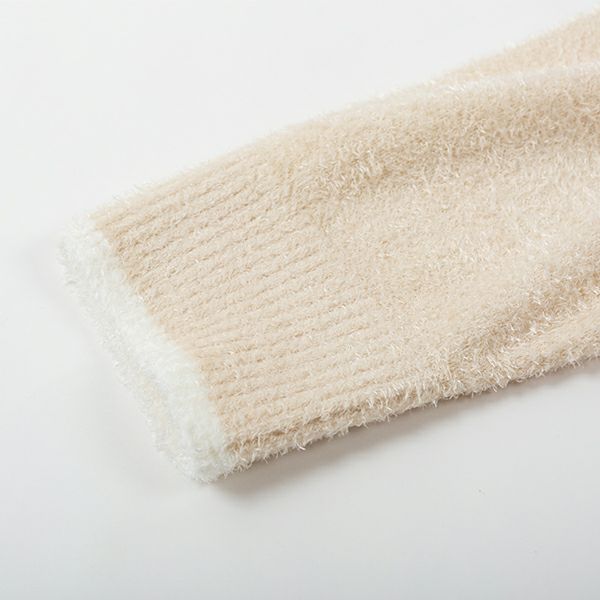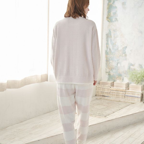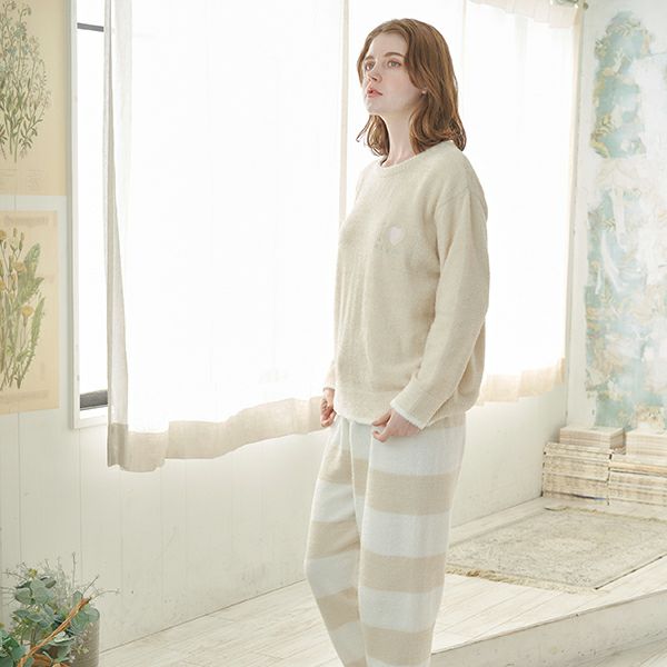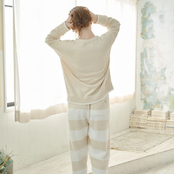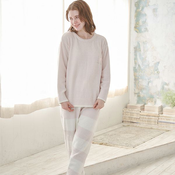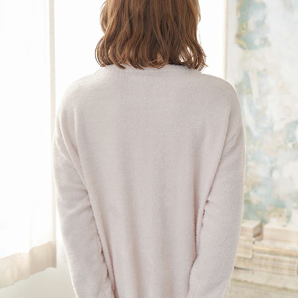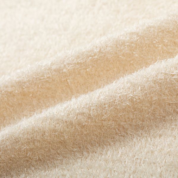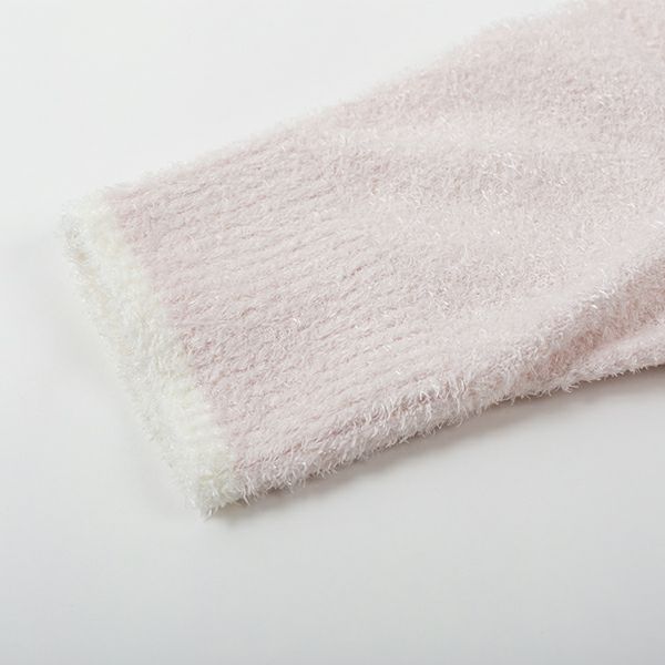 光沢のある毛足の長いニットを使ったベーシックな形のスポっと着られるプルオーバーです。軽くて柔らかく、見た目もかわいいモコモコ素材です。左胸にはI LOVE PJの刺繍を施し、袖と裾に白のラインを入れてワンポイントにしています。