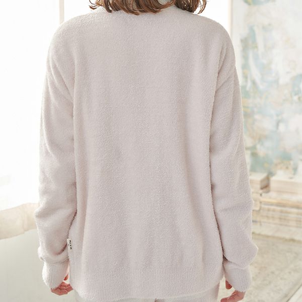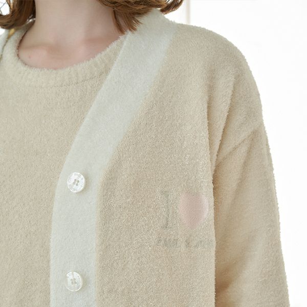 光沢のある毛足の長いニットを使ったVネックのカーディガンです。左胸にはI LOVE PJの刺繍を施し、衿に白のバイカラーをあしらってポイントにしています。軽くて暖かい素材ですので、空調のきいたお部屋や肌寒い日にサッと羽織れる便利なアイテムです。