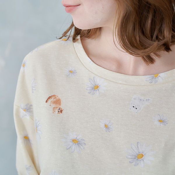 綿100%の天竺素材で柔らかく優しい肌触りのトップスです。袖のパフスリーブが女の子らしいデザインで、年間通して着易い5分袖となっています。ポール&ジョーのアイコン猫、ヌネットとジプシーが春のお花と共に散らばった春の訪れを感じられるアイテムです。