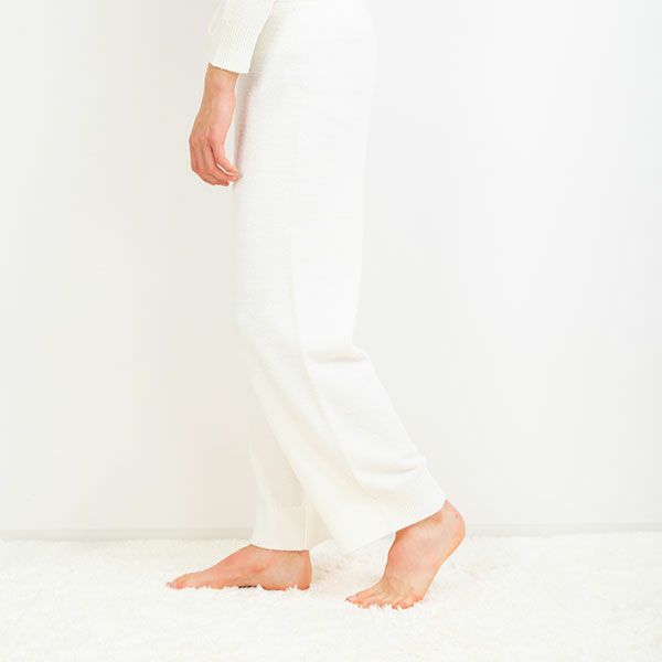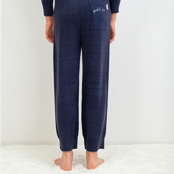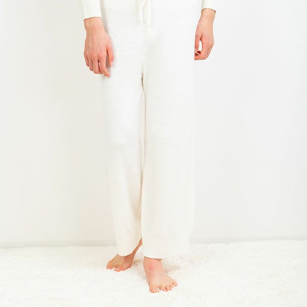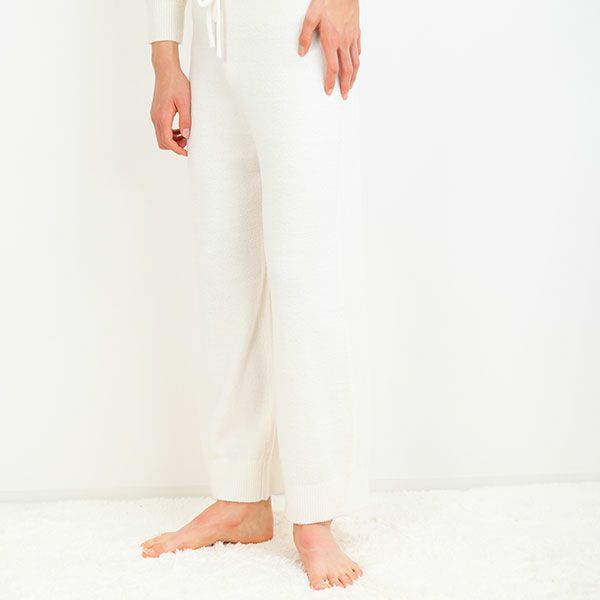 少し肌寒い春先、秋口にぴったりのライトな編立ニットのロングパンツです。ふんわりと軽く柔らかなベビモコ素材を使用しました。無地なのでお手持ちのお部屋着や他コレクションとも合わせやすいアイテムです。