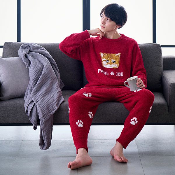 【ラッピング済み】【メンズ】ふわふわヌネットジャガード プルオーバー&ランダム猫足跡ジャガード ロングパンツ セットアップ