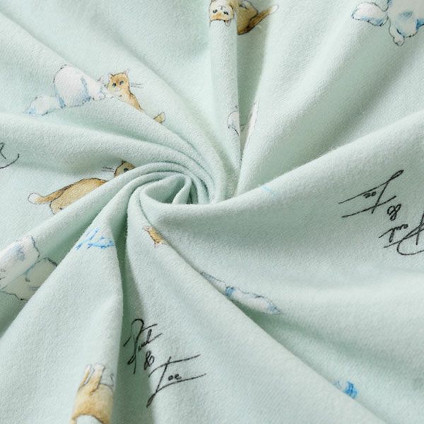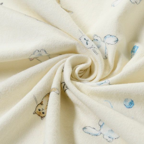 仲良く毛糸で遊ぶ猫がプリントされた暖かく肌触りが柔らかいのが特徴の綿ネル素材です。