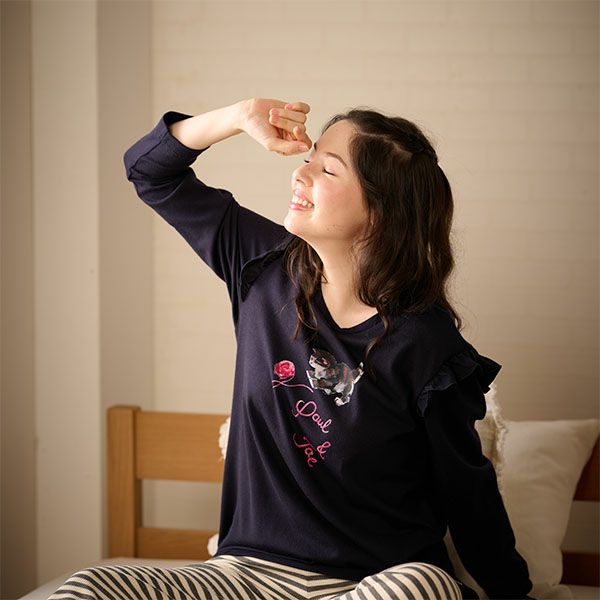 PAUL & JOEの今シーズン柄「毛糸で遊ぶ猫」が主役のルームウェア。