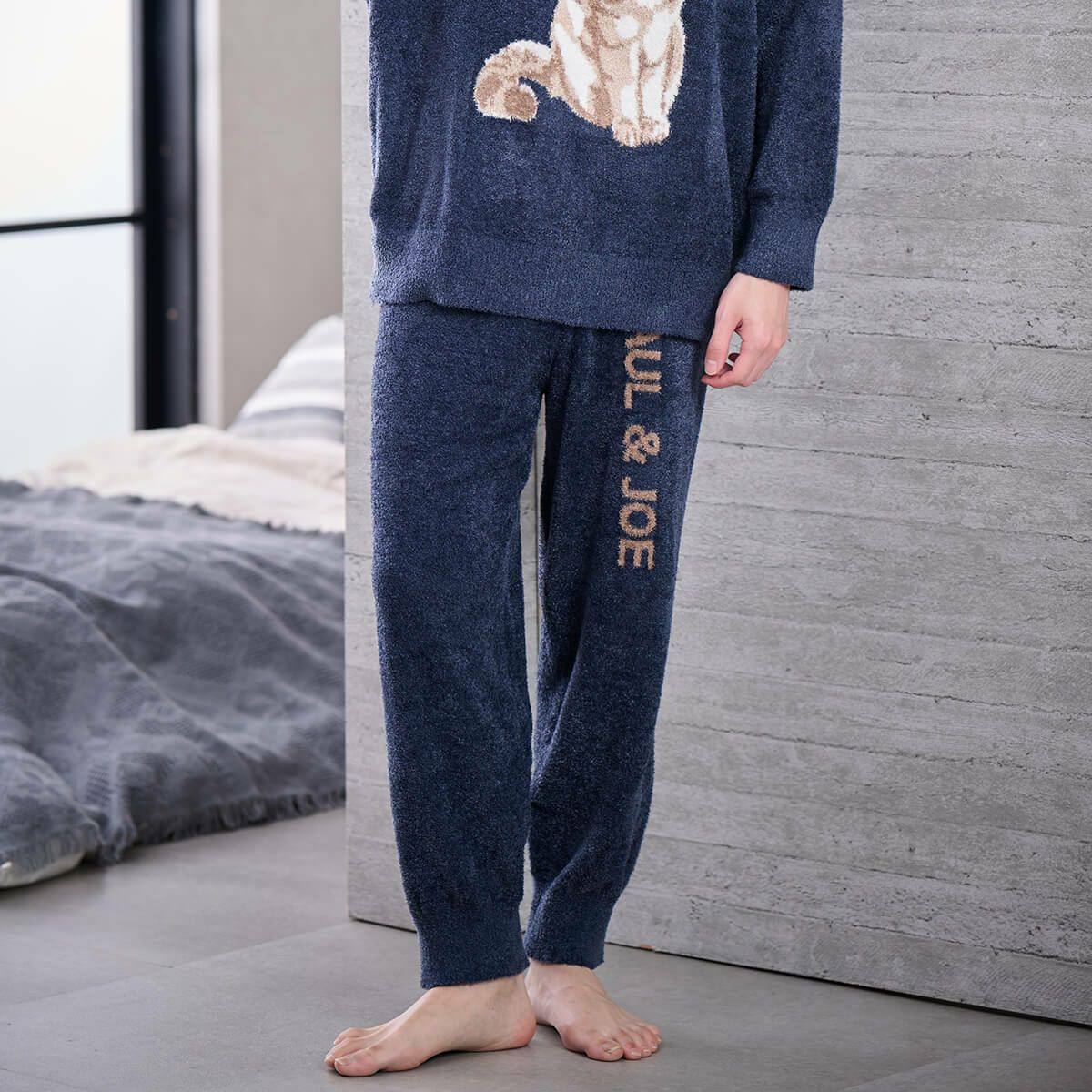 春・秋頃におすすめ!光沢のある毛足の長い薄手のニットを使用した、柔らかくて軽いロングパンツです。シンプルな無地に、PAUL&JOEのロゴが大きく編まれています。レディースもあるのでカップルでの着用もおすすめです。スッキリとしたシルエットでお家でも動き易くお過ごしいただけます。色はホワイト、ネイビーの2色展開です。