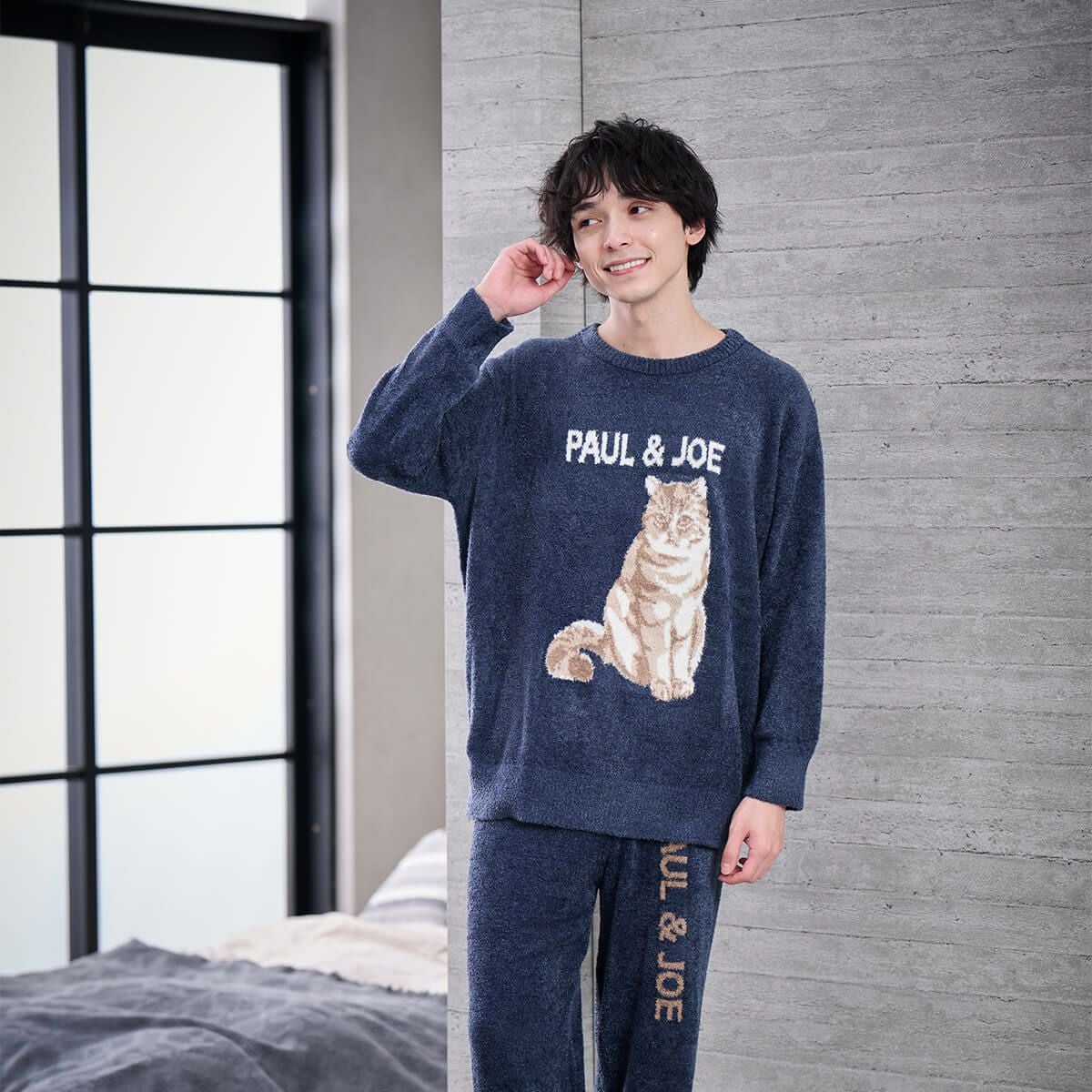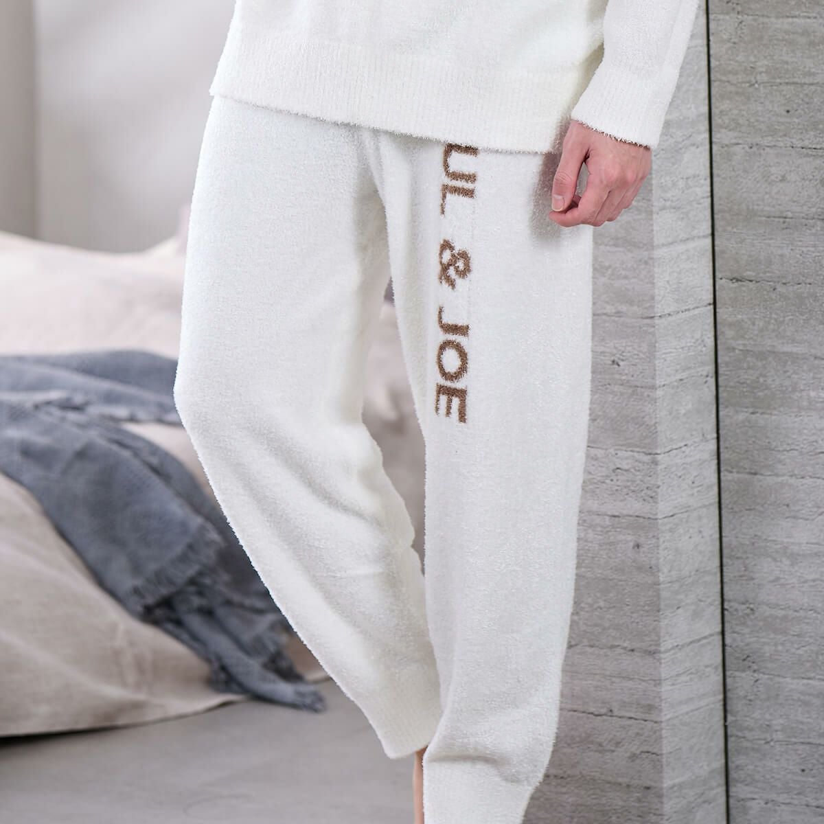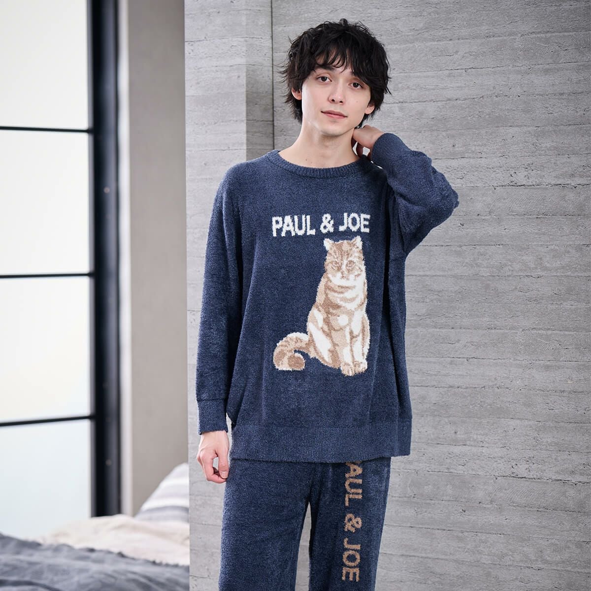 光沢のある毛足の長いニットを使用した、柔らかくて軽い着心地のプルオーバー&パンツです。シンプルな無地に、PAUL&JOEのロゴが大きく編まれています。レディースもあるのでカップルでの着用もおすすめです。スッキリとしたシルエットでお家でも動き易くお過ごしいただけます。色はホワイト、ネービーの2色展開です。