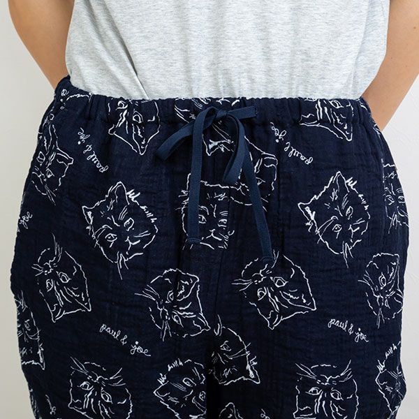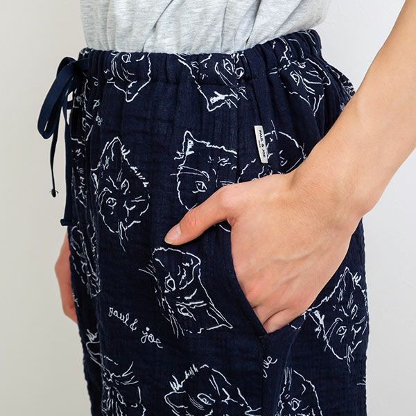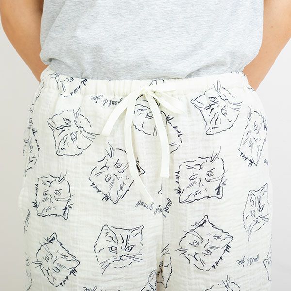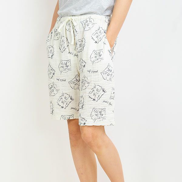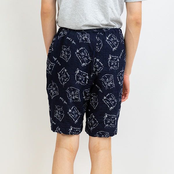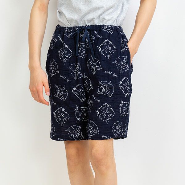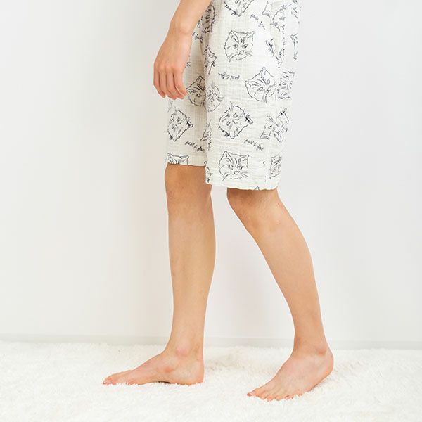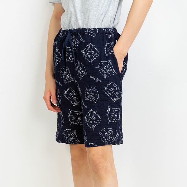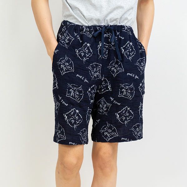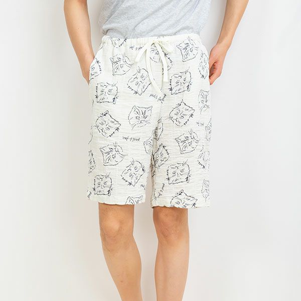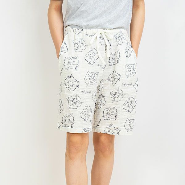 大人可愛いヌネットとジプシーをプリントしたメンズのハーフパンツです。肌あたりの良い綿の二重のガーゼに、シャーリング加工を施して凹凸感を出した生地なので、さらっとした着心地を楽しめます。またガーゼならではの肌触りと柔らかさが、やさしく体をつつみます。