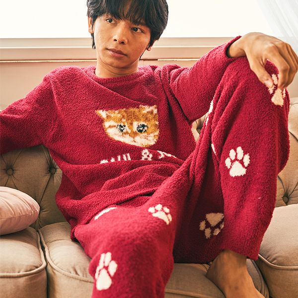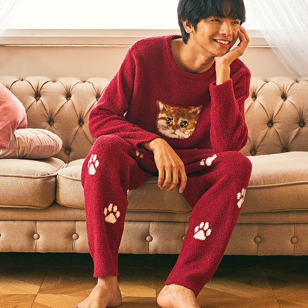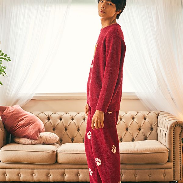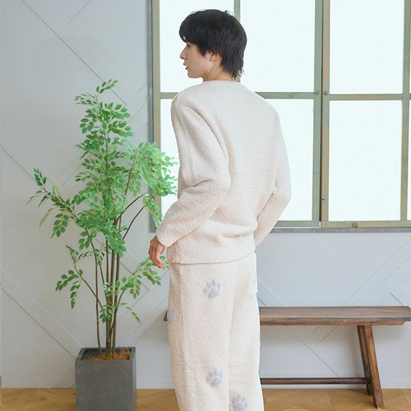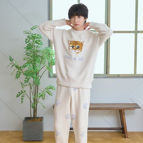 【ラッピング済】【メンズ】ふわふわヌネットジャガード プルオーバー&ランダム猫足跡ジャガード ロングパンツ セットアップ
