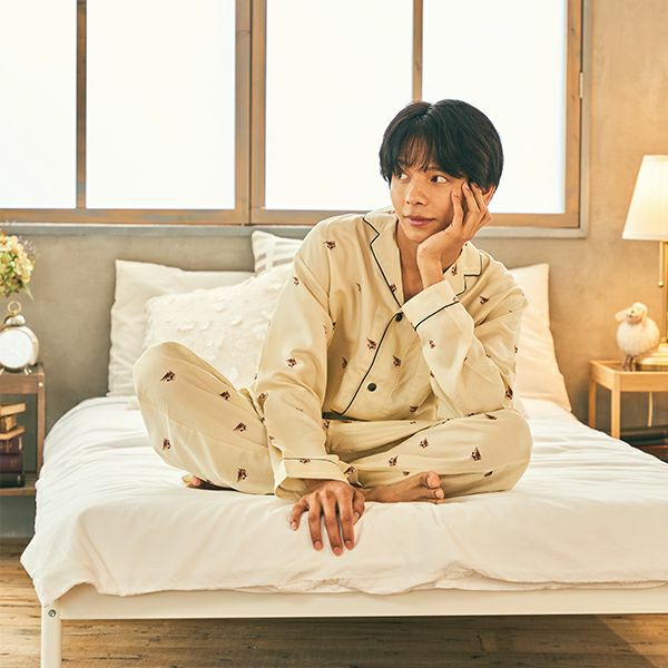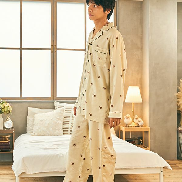 ブランドのアイコン“ヌネット”モチーフを一面にちりばめた長袖シャツと長ズボンのメンズセットアップです。