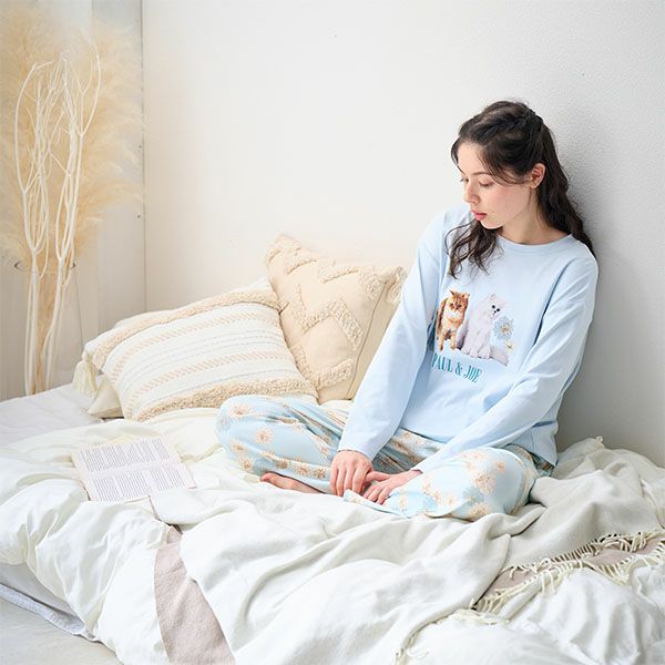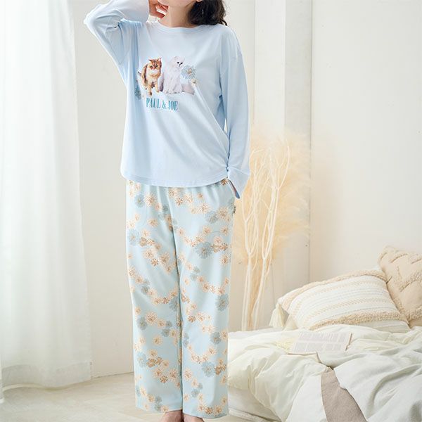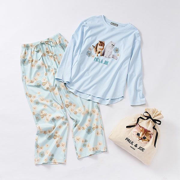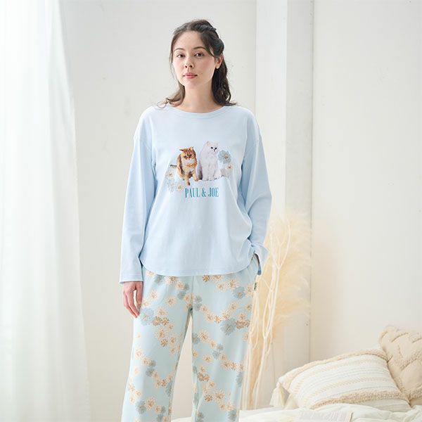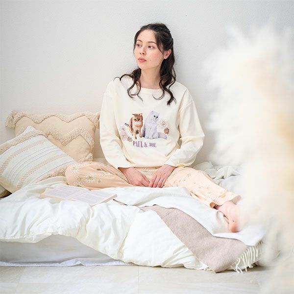 PAUL & JOEのアイコン猫、ヌネットとジプシーが仲良くお座りした愛らしいプリントのパジャマです。トップスの裾はラウンドカットで、さりげない可愛さをプラス。