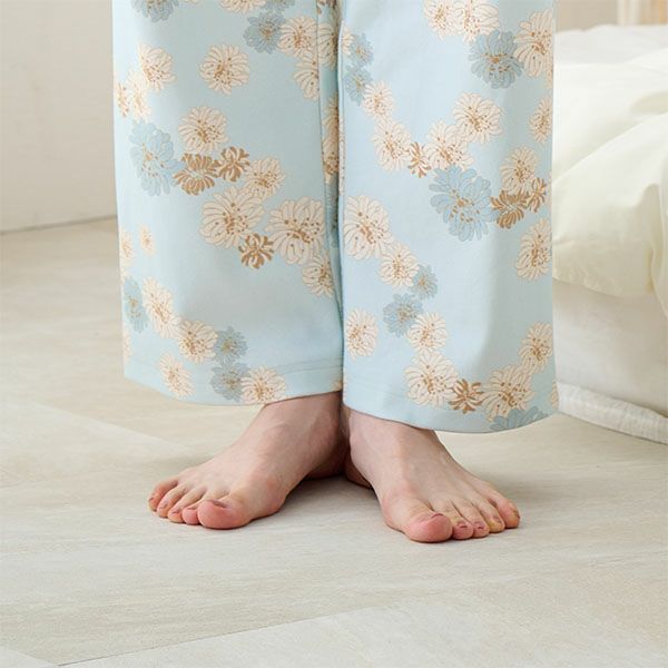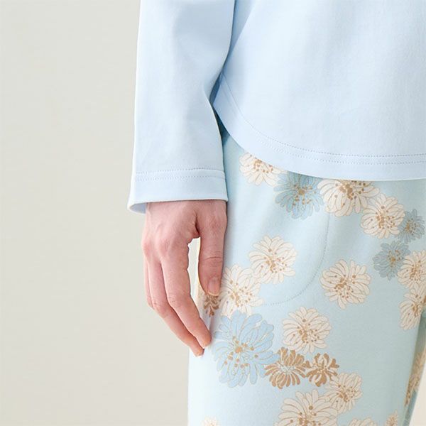 セットのパンツはブランドを象徴するクリザンテーム(菊)の花柄をあしらい、華やかで女性らしい印象に。