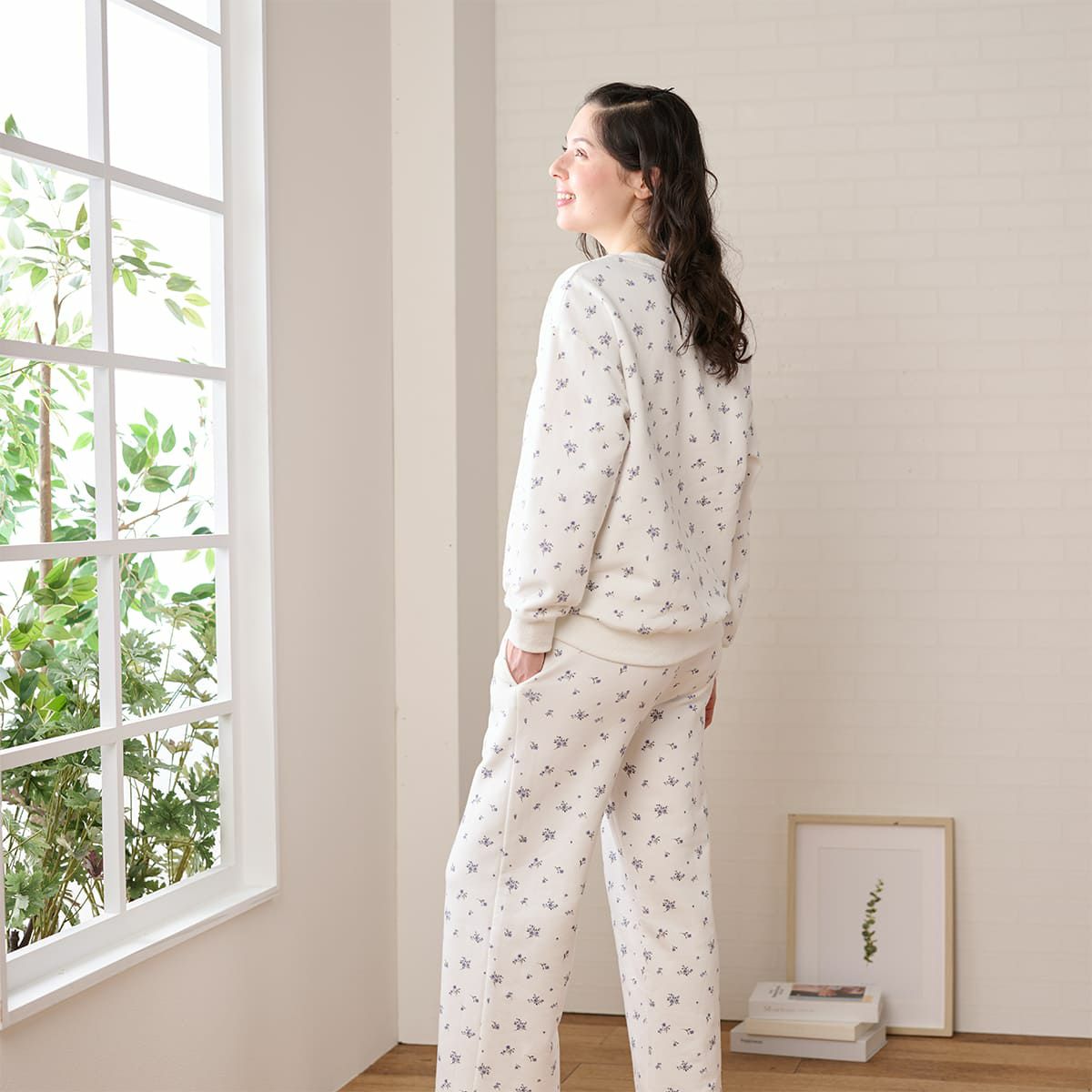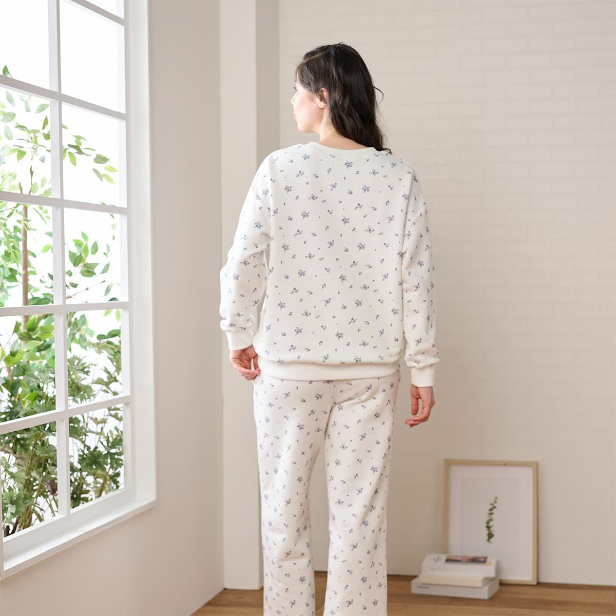 ベースに小花を散りばめたプリントの、裏起毛でふんわりもちもちのスウェットとストレートパンツのセットです。