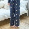 綿100%の滑らかで肌触りの良いスムース生地を使用したセミフレアパンツです。両脇にポケットがついておりウエストはゴム仕様で紐が通っています。猫と足跡が散りばめられたとってもキュートなプリントです。トップスと合わせてセットアップで着用頂けます。