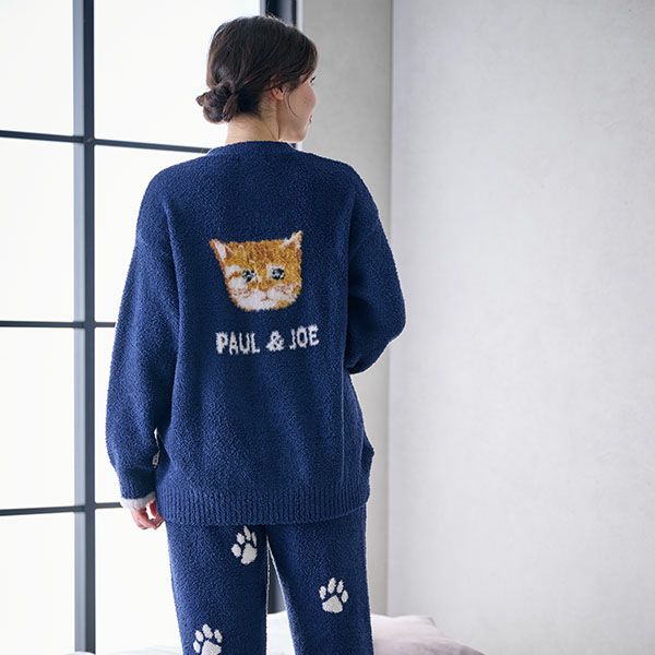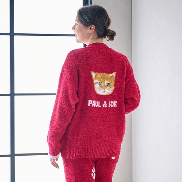 後ろ中央にはふわふわの猫とロゴが編まれており肉球がプリントされたボタンがついた猫好きにはたまらない一枚となっています。とても暖かく本格的に寒くなる時期にも丁度いい厚さのニットです。