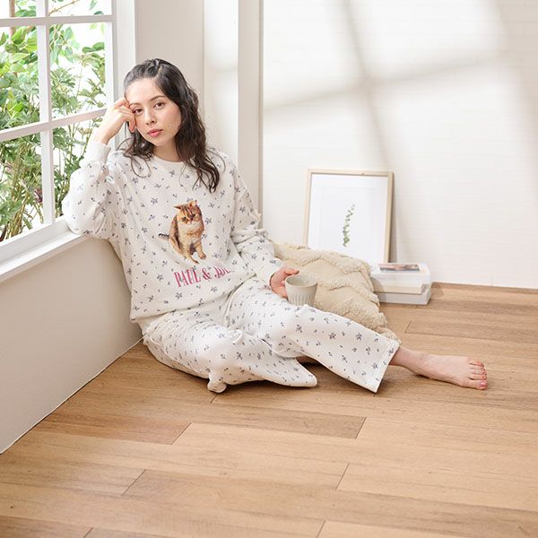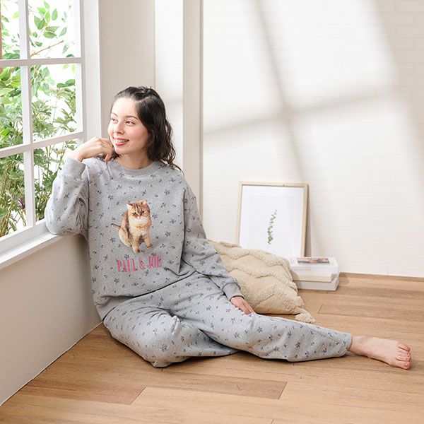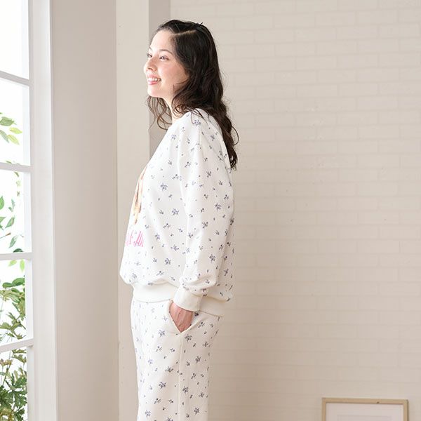 ベースに小花を散りばめたプリントの、裏起毛でふんわりもちもちのスウェットとストレートパンツのセットです。 トップスにはヌネットの実写プリントとロゴをあしらい、可愛さをプラス。 パンツはストレートシルエットで、ゆったりとした履き心地ながらすっきり見えるデザイン。 裏起毛の柔らかな肌触りで、お部屋でのリラックスタイムやおうち時間を快適に、そして可愛く彩る一着です。