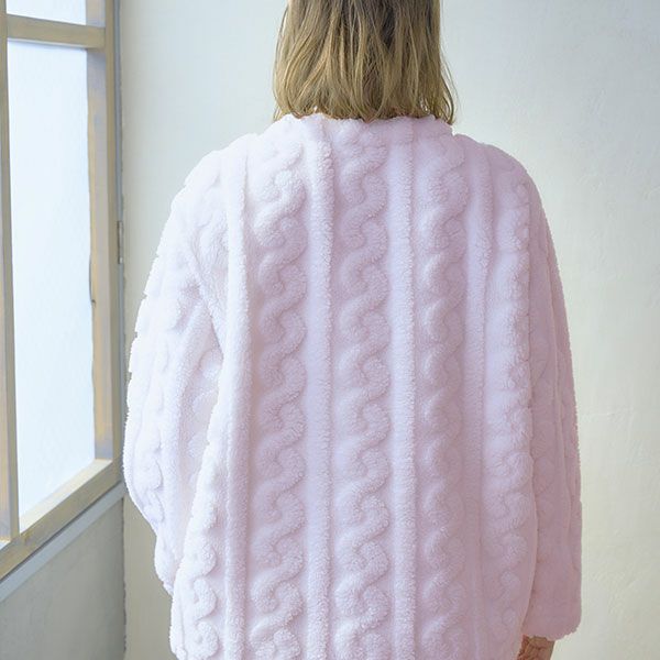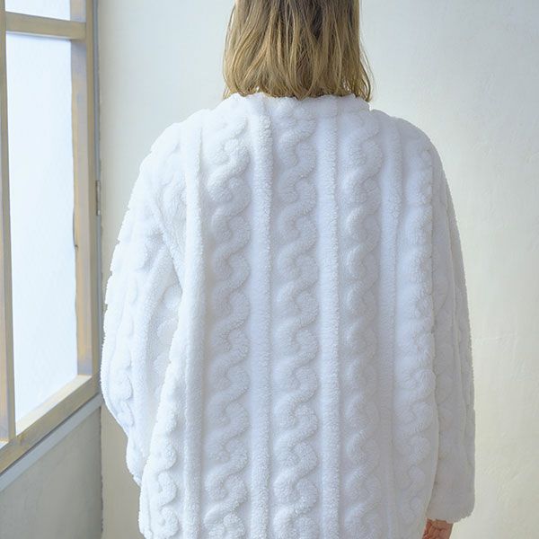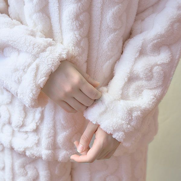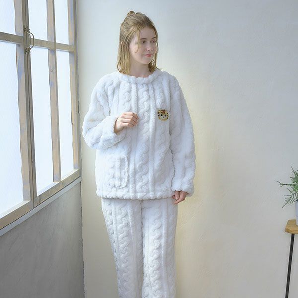 軽量で保温性のあるフリースの大きな縄目模様をかたどったもこもこ感がとっても可愛いパジャマです。大きめの作りなので羽織り感覚で着ていただけます。胸元にはブランドのアイコンの猫“ヌネット”がついており、一日の終わりに寄り添ってくれます。