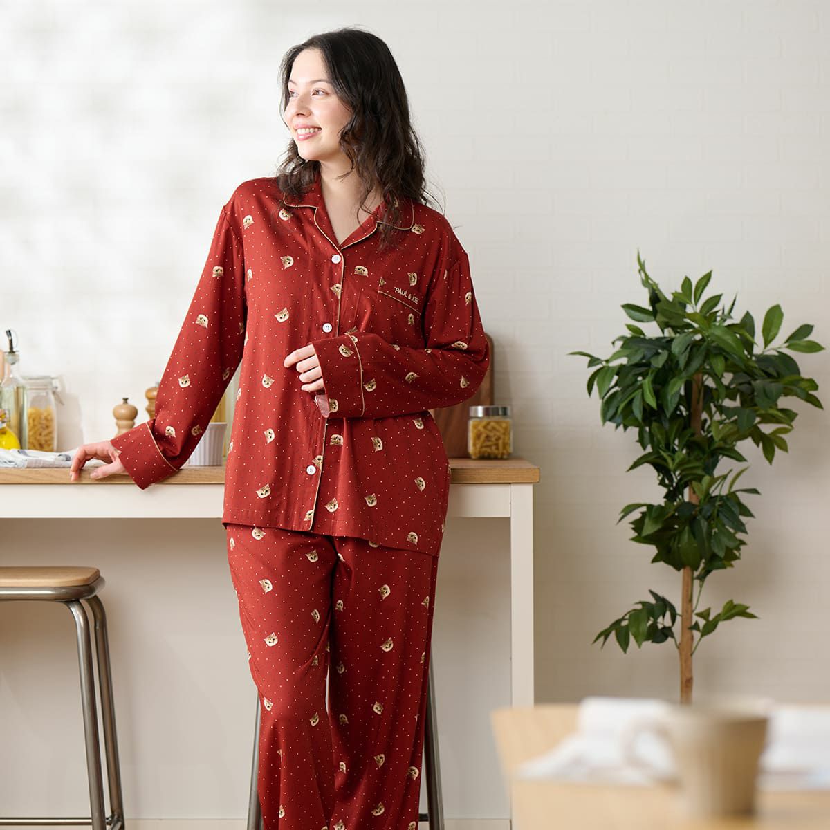 カラーは秋冬に映えるシックな赤と紺。リラックスタイムもぐっと華やかにしてくれる、贅沢な一着です。