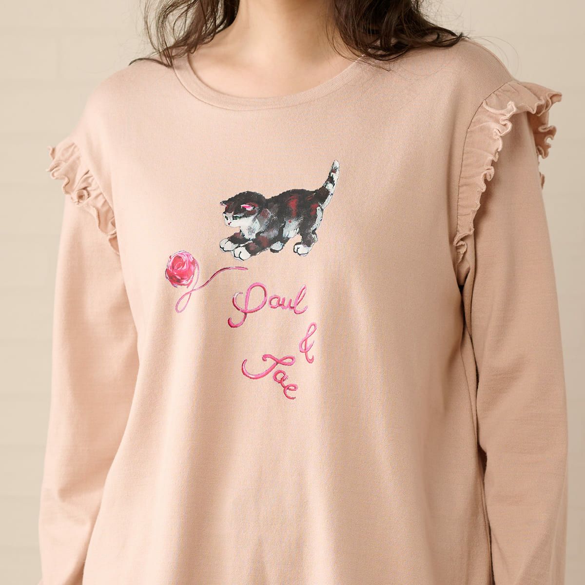肩にはふんわりフリルをあしらい、フェミニンなアクセントをプラスしました。
