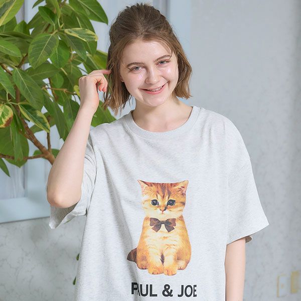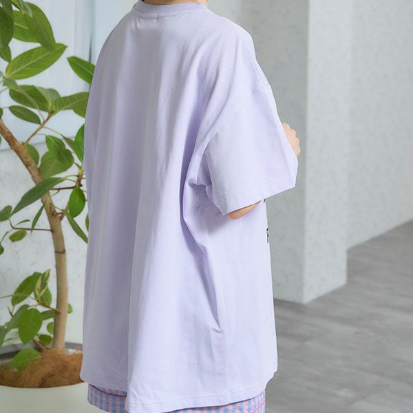 グレーとパープルそれぞれに違う色のリボンをつけた”ヌネット”がプリントされています。オーバーサイズなので、さらっと一枚で着用できるのはもちろん、体のラインをひろわずドロップする肩周りが華奢に見せてくれます。 綿100%の天竺素材で伸縮性があり肌触りが心地いいTシャツです。