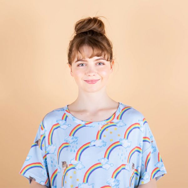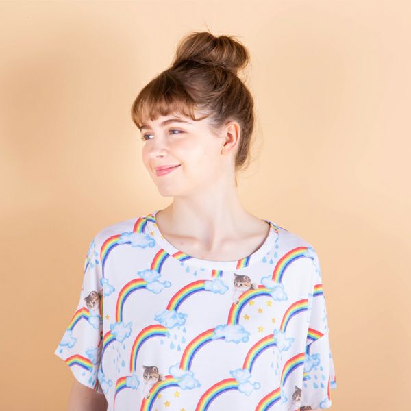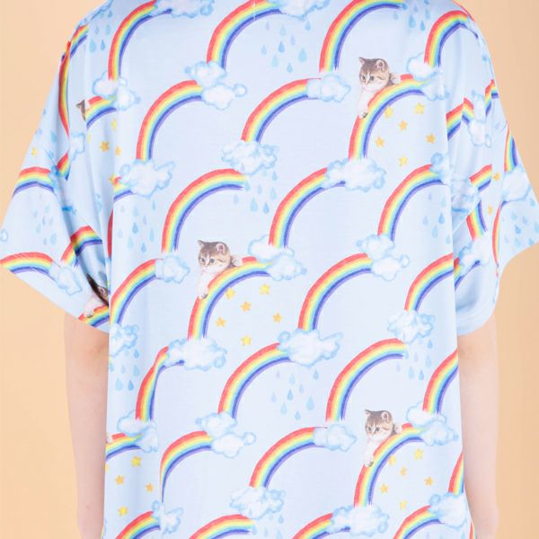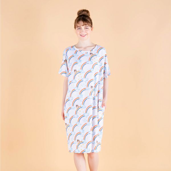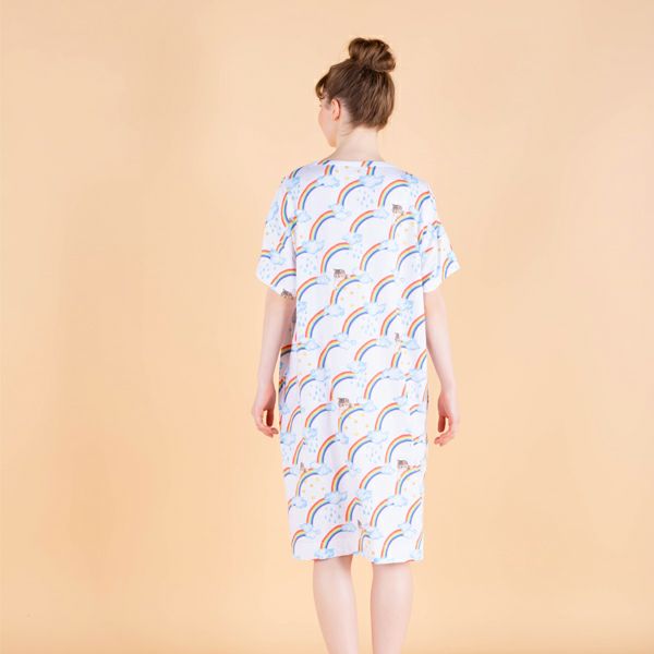 女性らしいとろみのある素材を使用した、ブランドアイコンのヌネットと虹の可愛い柄がプリントされたワンピースです。ゆったりめのシルエットに、膝丈まであるワンピースなので一枚でも着やすいアイテムです。両サイドにスラッシュポケットがついているのも便利です。