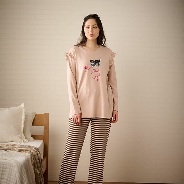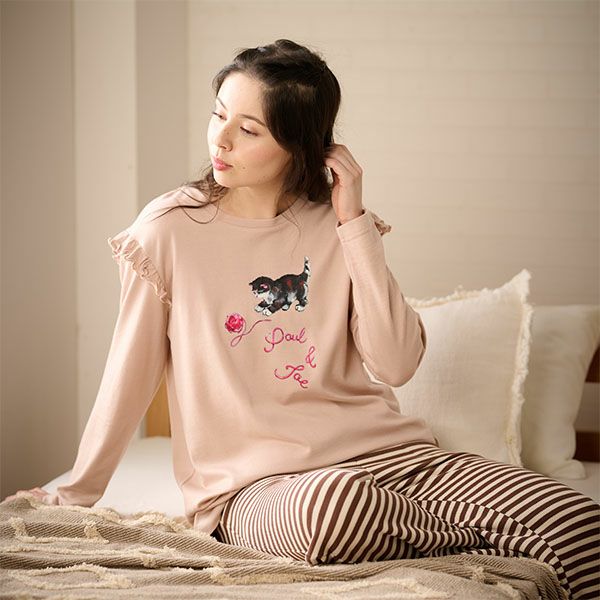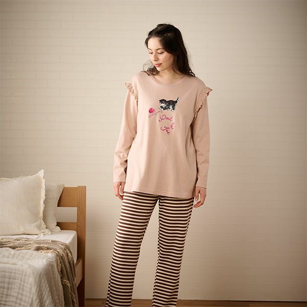 PAUL & JOEの今シーズン柄「毛糸で遊ぶ猫」が主役のルームウェア。