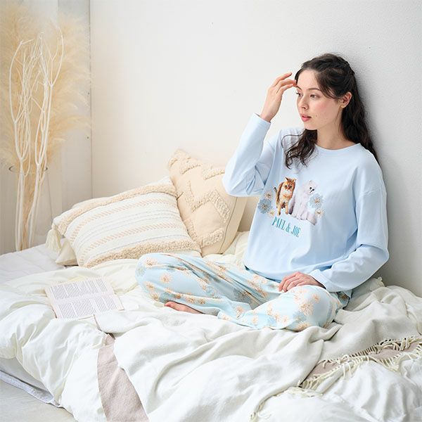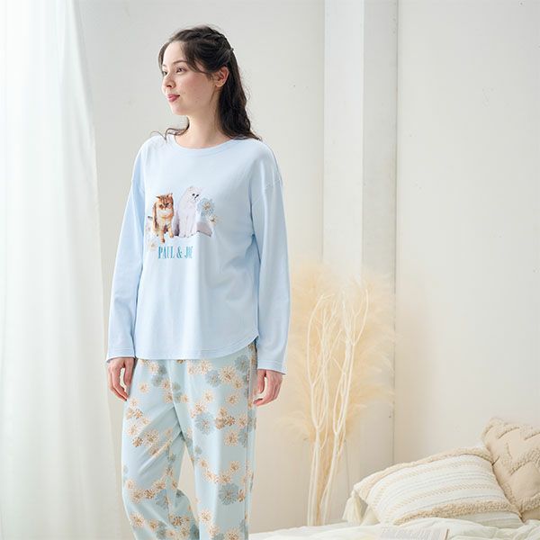 PAUL & JOEのアイコン猫、ヌネットとジプシーが仲良くお座りした愛らしいプリントのパジャマです。トップスの裾はラウンドカットで、さりげない可愛さをプラス。