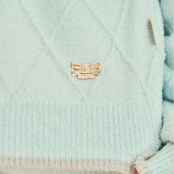 光沢のある糸で冬らしいアーガイル柄に編み立てました。PAUL&JOEのロゴ入りのリボン型の金色モチーフが付いています。