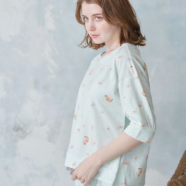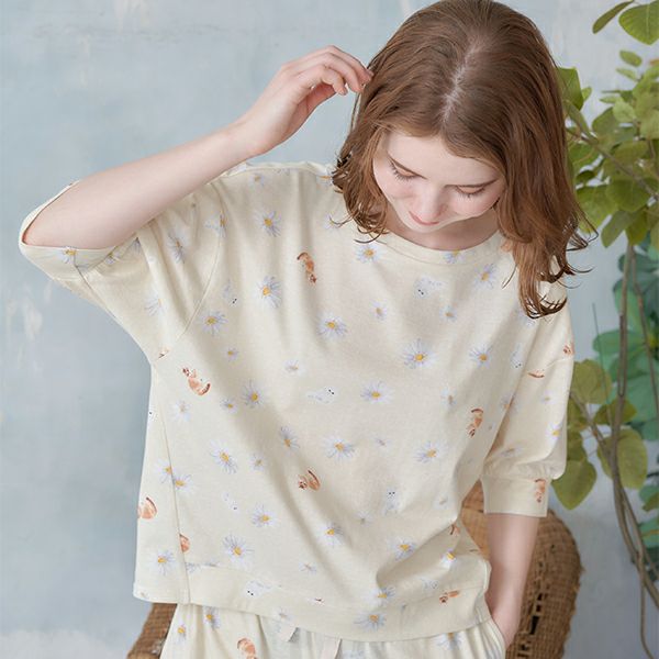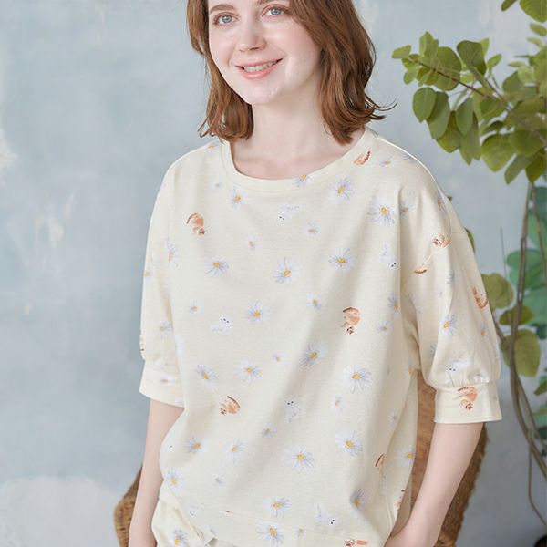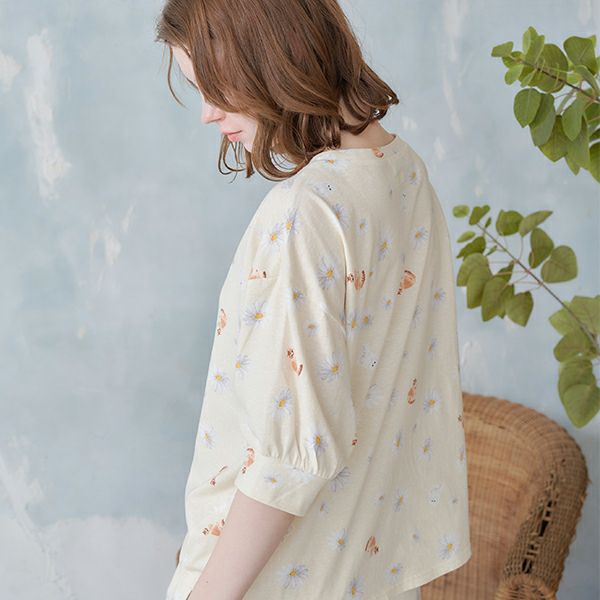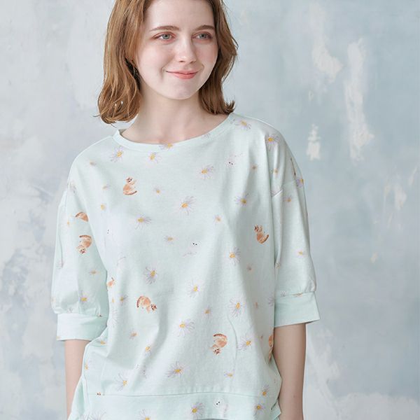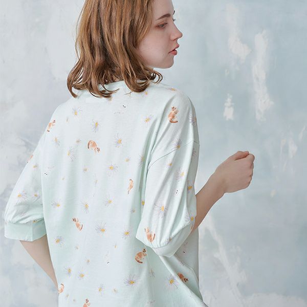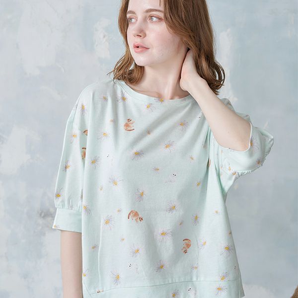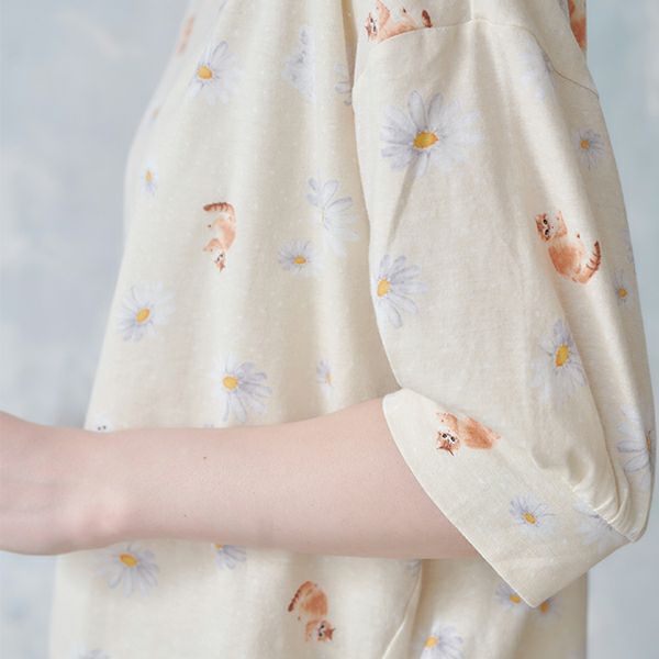 綿100%の天竺素材で柔らかく優しい肌触りのトップスです。袖のパフスリーブが女の子らしいデザインで、年間通して着易い5分袖となっています。ポール&ジョーのアイコン猫、ヌネットとジプシーが春のお花と共に散らばった春の訪れを感じられるアイテムです。